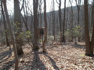 No action, so I got up and started my slow stalk uphill. I found a boundary of blue painted trees and these tree-house style stands, but no park boundary. I thought it would be well marked, but maybe not on the south end?? I walked to the crest of the hill but no park boundary. Coming back down I decided to mark the stand and corner boundary location on my gps and get a couple pictures of it below:
